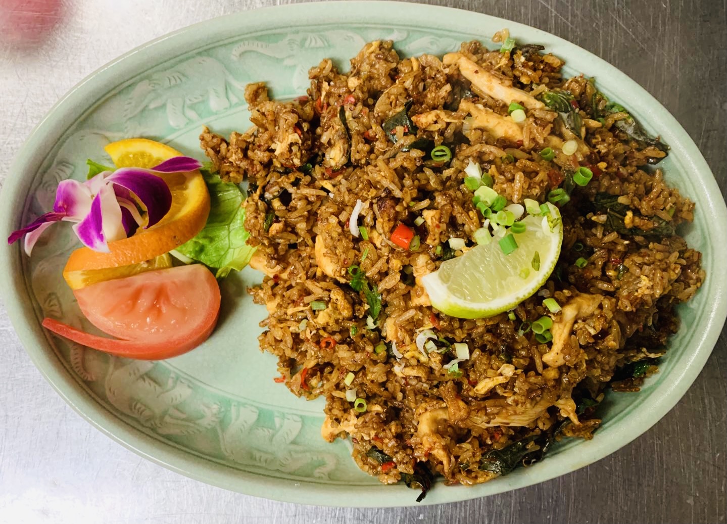 99. Sauté de riz pimenté au basilic Thaï (avec poulet/porc/crevettes/bœuf)