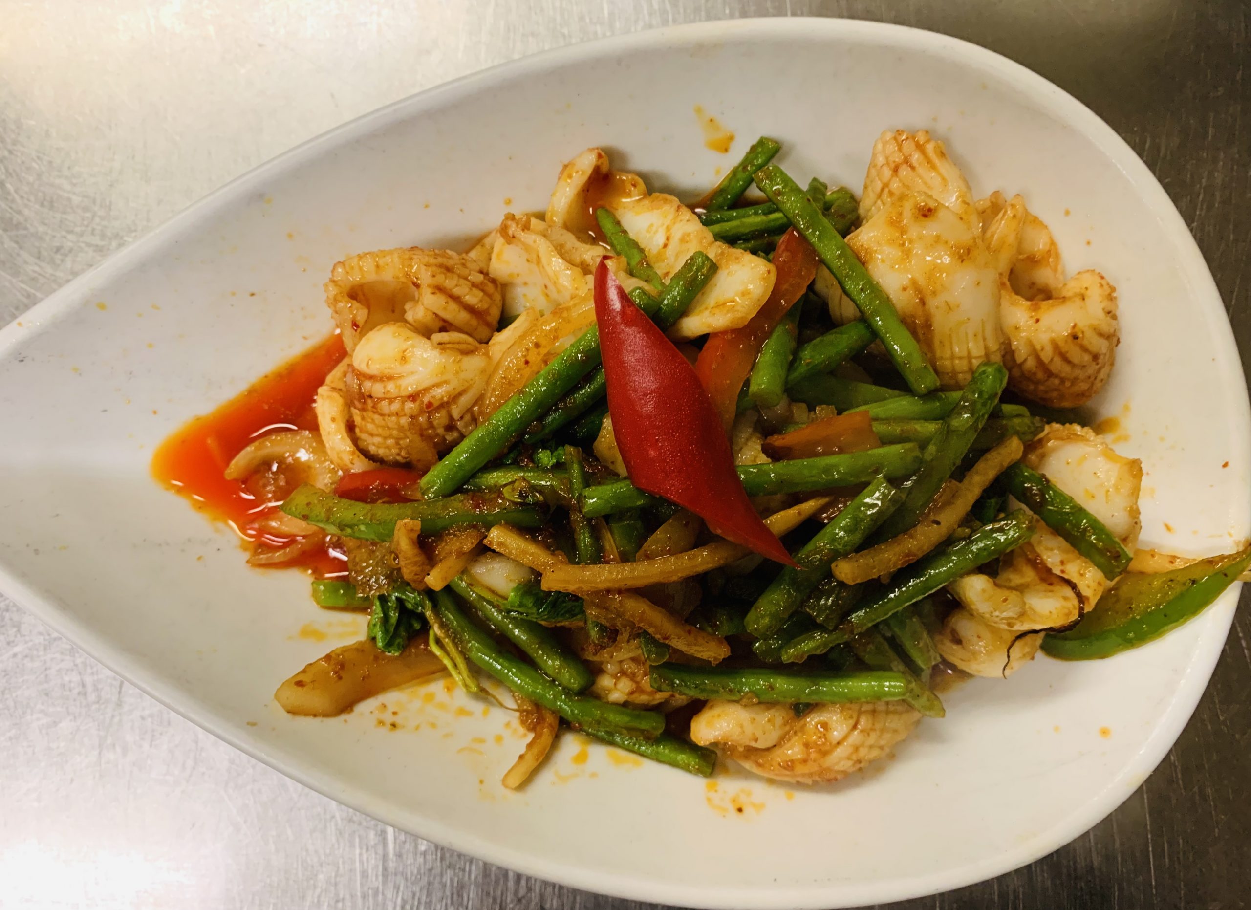 Phad Prik Khing Ola Mueck ปลาหมึกกับถั่วเขียว